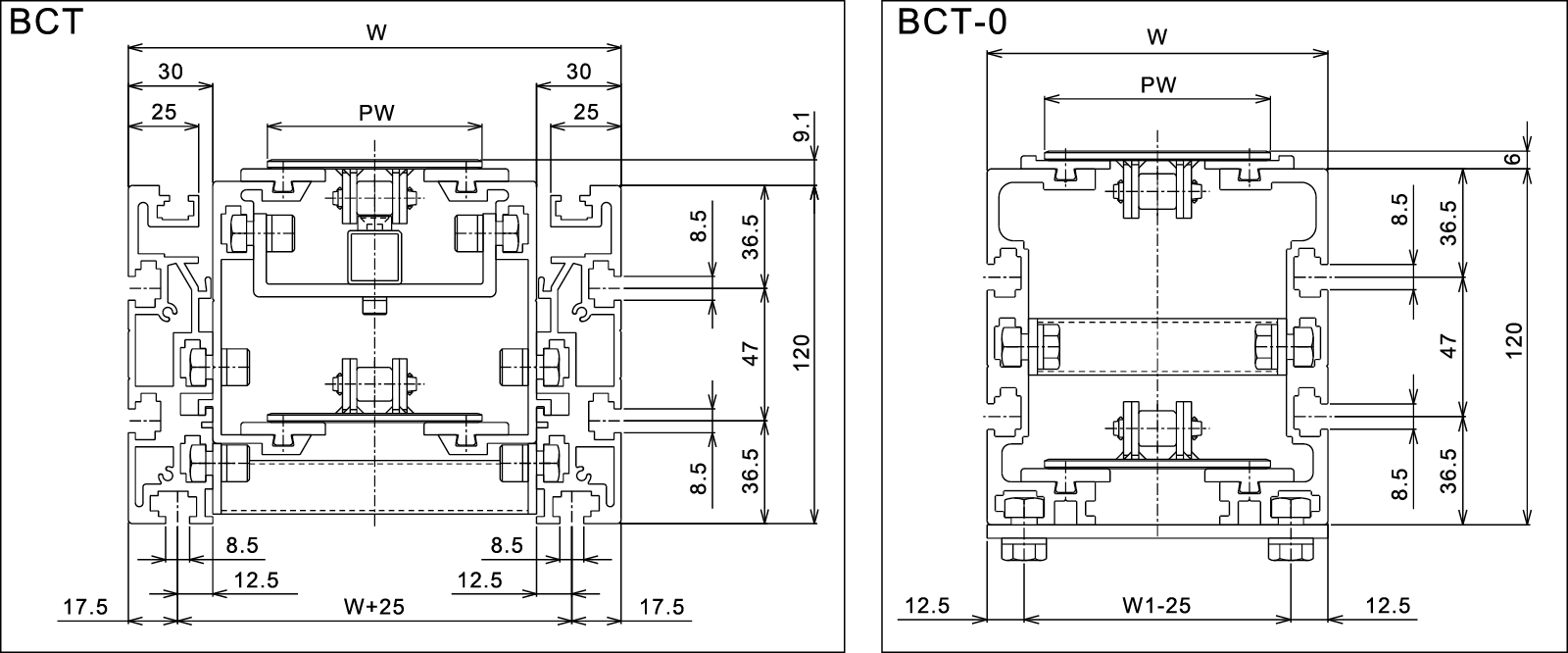 | Rollerbane | P (mm) | 50 75 100 | 50 75 100 | 75 100 | 75 100 | 75 100 | 75 100 |