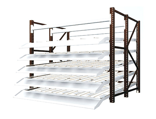 Flydende hylder er generelt konstrueret ved hjælp af rulletype aluminiumslegering eller plademetalfluentstænger på mellemstore til lette belastningshylder med flydende stænger placeret på cirka 3 grader. De varer, der bæres af flydende hylder, pakkes normalt i papir eller placeres i plastomsætningsbokse inde, ved hjælp af deres egen vægt til at opnå strømmen og i ud af varer, hvilket gør opbevaring og adgang praktisk. Enhedsbelastningskapaciteten for flydende hylder er normalt omkring 100 kg pr. Lag, og hyldehøjden er inden for 2,5 meter. Flydende hylder er velegnede til procesomdannelse på begge sider af samlebånd, samlebåndsproduktion og plukningsoperationer i distributionscentre. De kan være udstyret med elektroniske tags for at opnå informationsstyring af varer. Bredt brugt i brancher såsom bilindustri, farmaceutisk, kemisk og elektronik.